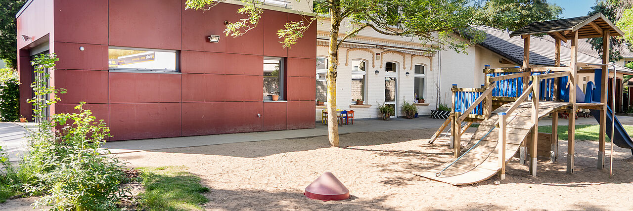 Das naturnahe Außengelände lädt bei Wind und Wetter zum Spielen, Klettern und Entdecken ein – ein Ort, an dem Bewegung, Erleben und Naturerfahrung großgeschrieben werden.