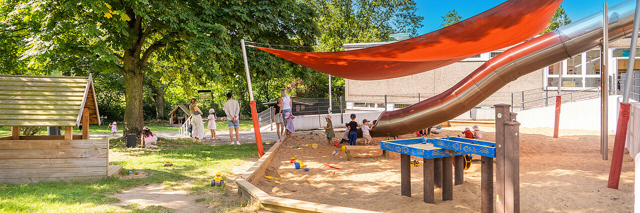 Das rund 3.000 Quadratmeter große Außengelände lässt Kinderherzen höherschlagen. Große Wiesenflächen, Kletter- und Spielgeräte, eine Matschanlage und naturnahe Bereiche regen die Fantasie an und fördern die Bewegung im Freien.